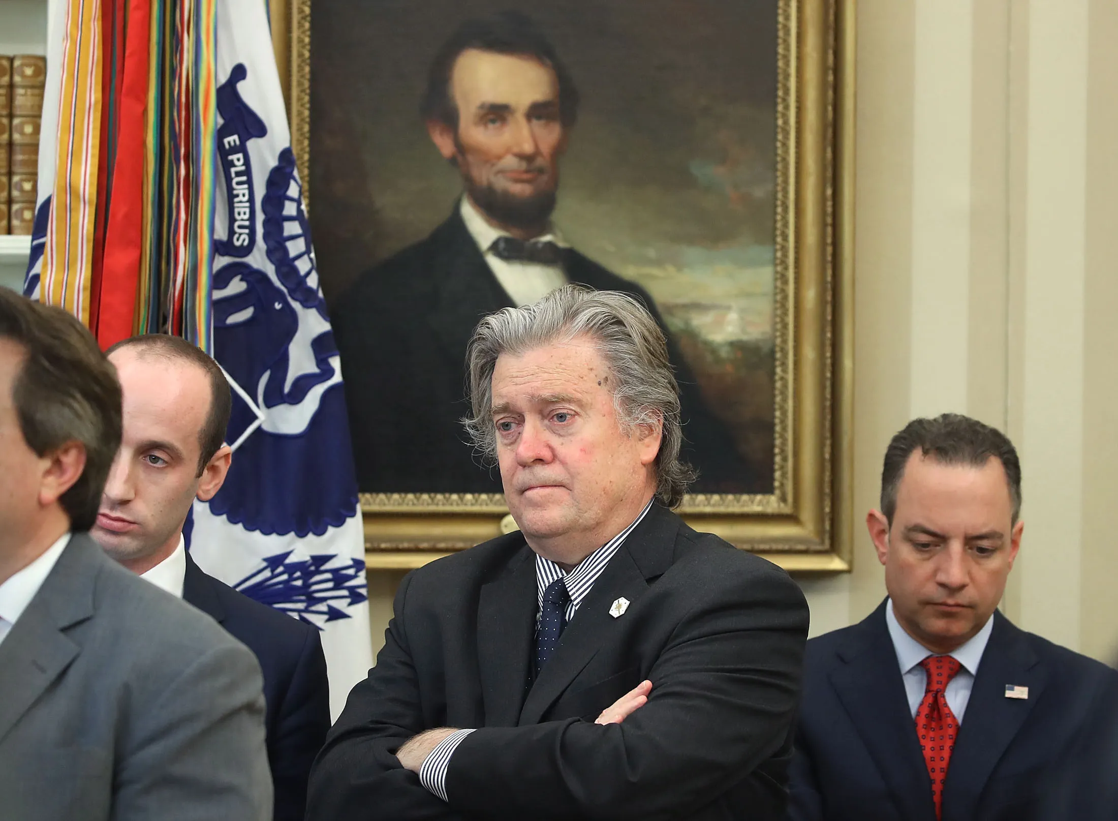 从左到右:顾问斯蒂芬·米勒、班农和白宫幕僚长赖因斯·普里巴斯在2017年4月20日特朗普总统在椭圆形办公室签署关于钢铁进口调查的总统备忘录前倾听。摄影师:马克·威尔逊/盖蒂图片社北美当班农从他负责 布赖特巴特新闻 的职位加入竞选时,特朗普正陷入争议,并在民调中落后于克林顿。他刚刚主持了一场黑暗而分裂的共和党大会,其主题与总统候选人通常试图传达的乐观情绪形成鲜明对比。在大会后的几周内,特朗普与福克斯新闻的凯莉以及2004年在伊拉克战争中被杀的穆斯林美国陆军上尉胡马雍·汗的父母发生了公开争执。