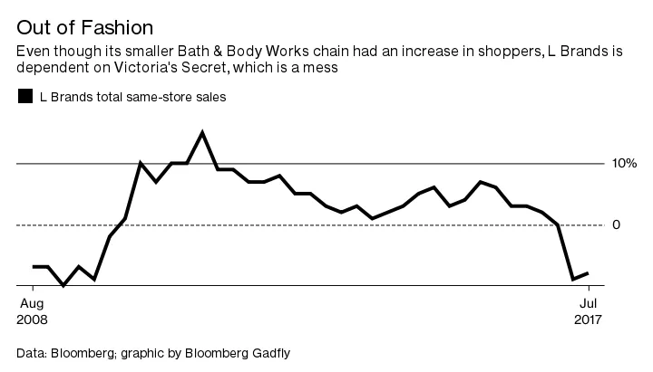 显然,它并不是唯一一个在满足消费者对时尚、合身和成本偏好的方面苦苦挣扎的品牌。但它在这些方面都限制了自己,现在这个连锁店——以及它的股东——正在为此付出代价。L Brands的股票本周跌至六年来的最低点,此前它给出了疲软的利润预测,并报告维多利亚的秘密在最新季度的同店销售下降了14%。Bath & Body Works占L Brands收入的约30%,并且在上个季度的增长速度超出了预期。但内衣连锁店仍然是L Brands业绩的最大决定因素。