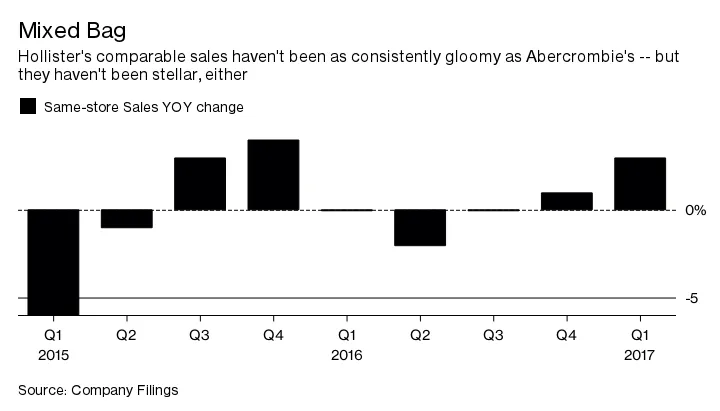 与此同时,Abercrombie 最好的救赎希望似乎是它的 Hollister 连锁店,现在占公司年销售额的一半以上。Hollister 比 Abercrombie 品牌更健康,并且在建立忠诚度计划方面做得相当出色,同时吸引了一个 notoriously fickle 的购物人群。但它最近的可比销售业绩并不算出色。