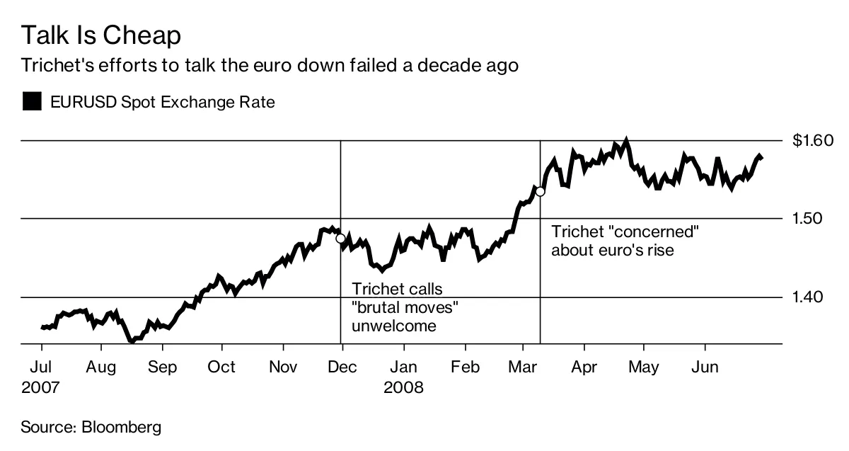 当时,欧元在前半年的时间里对美元上涨了近10%。在特里谢的口头干预后的六个月里,它又上涨了8%,达到了1.60美元的历史最高点,即使在2008年3月第二次试图让其贬值之后。