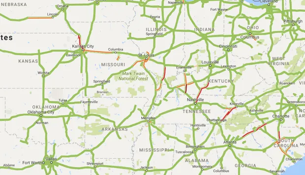 红色和黄色的道路遵循日食的路径。谷歌地图这些截图是在东部标准时间下午3:30左右拍摄的,在大多数城市的高峰时段之前。注意像夏洛特、亚特兰大和达拉斯这样的大城市与穿过圣路易斯、纳什维尔和格林维尔的红色带相比,保持无交通状态。