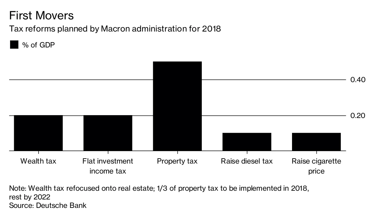 将法国的赤字控制在GDP的3%以下的斗争也延迟了“马克龙经济学”的另一个关键部分:减轻企业的税负。就在上周,政府出人意料地表示,可能会暂时对大型企业征收每年20亿欧元(24亿美元)的税,以填补前任政府留下的预算漏洞。此前,政府还将另一项旨在降低工资税的措施推迟到2019年。马克龙承诺将企业税率从33%降至25%的计划现在——这可能使公司收益增加12%——将直到2022年才能完全实施。