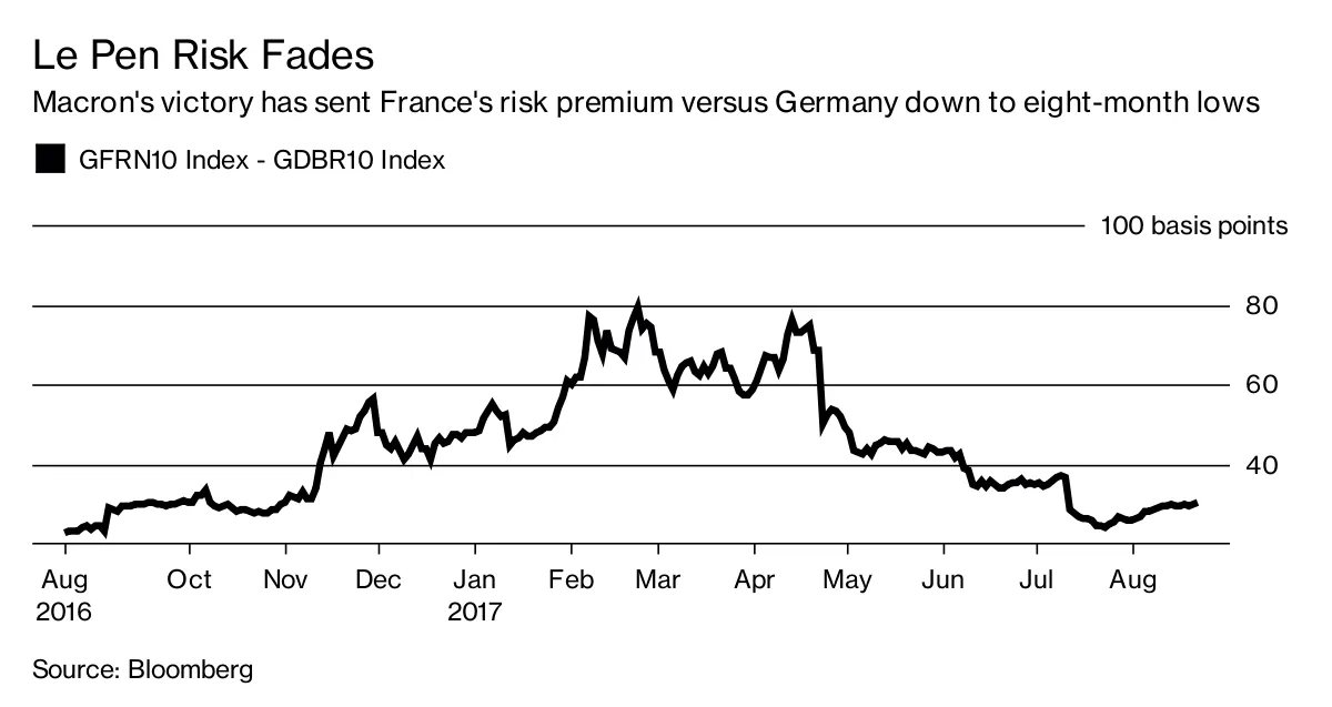 投资者正在押注经济顺风将帮助马克龙推动劳动改革并促进他其余议程的实施。到目前为止,迹象良好。马克龙的政府选择了一种快速通道策略来处理劳动方案,希望通过限制议会的辩论在十月之前完成整个方案。