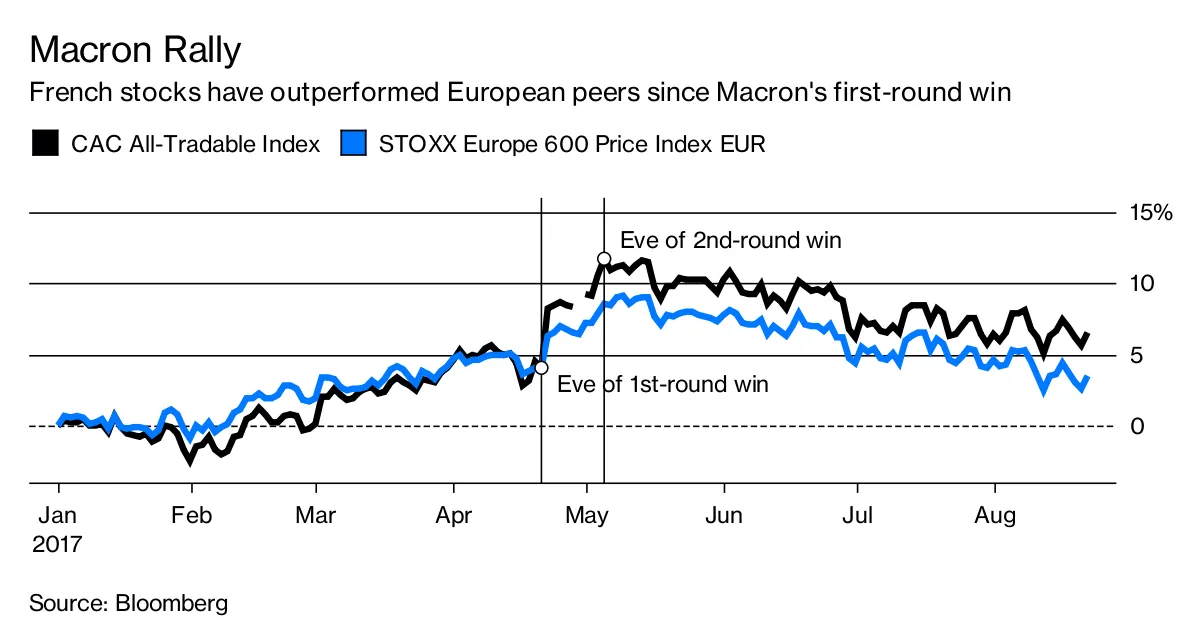 尽管如此,投资者和高管们依然乐观。法国SBF 250股票市场指数今年迄今上涨了7%,表现优于德国和欧洲的蓝筹股。法国和德国债券收益率之间的利差自2月份选举焦虑的高峰以来大幅下降,当时玛丽娜·勒庞是主要竞争者。首席执行官们积极谈论他们所称的“马克龙效应”,从法兴银行到圣戈班公司等企业都提到气氛的改善。