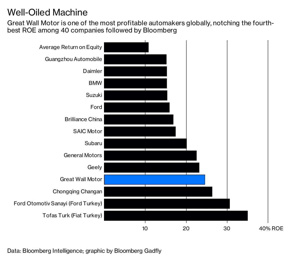 作为一家精益公司,分析师估计长城60%的零部件在内部生产。它在营销上的支出很少,是全球净利润率和股本回报率第四高的汽车制造商。其投资资本回报率在彭博情报追踪的40家制造商中排名第一。