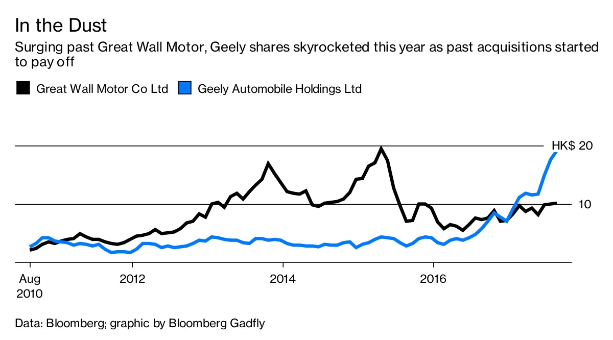 长城汽车最近与收购菲亚特克莱斯勒汽车公司旗下的吉普部门的暧昧关系,引发了与一家竞争对手中国汽车制造商的相似之处,该公司在海外的收购促进了成功:自2010年收购沃尔沃汽车以来,吉利汽车控股有限公司的股价上涨了600%,并且在香港恒生指数中是今年表现最好的公司。