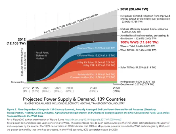 在其中,作者首先估计到2050年所有139个国家的平均年电力需求——包括在“商业照常”和完全电气化的“风水太阳”情景下。对于每个国家,研究人员分析可用的环境资源(如光伏面板的屋顶、潮汐电力的海岸线和风力涡轮机的空地),以确定满足该需求的太阳能、风能、水电和地热技术的组合。(值得注意的是,雅各布森因其环境影响和安全风险而将核能排除在他的建议之外。)