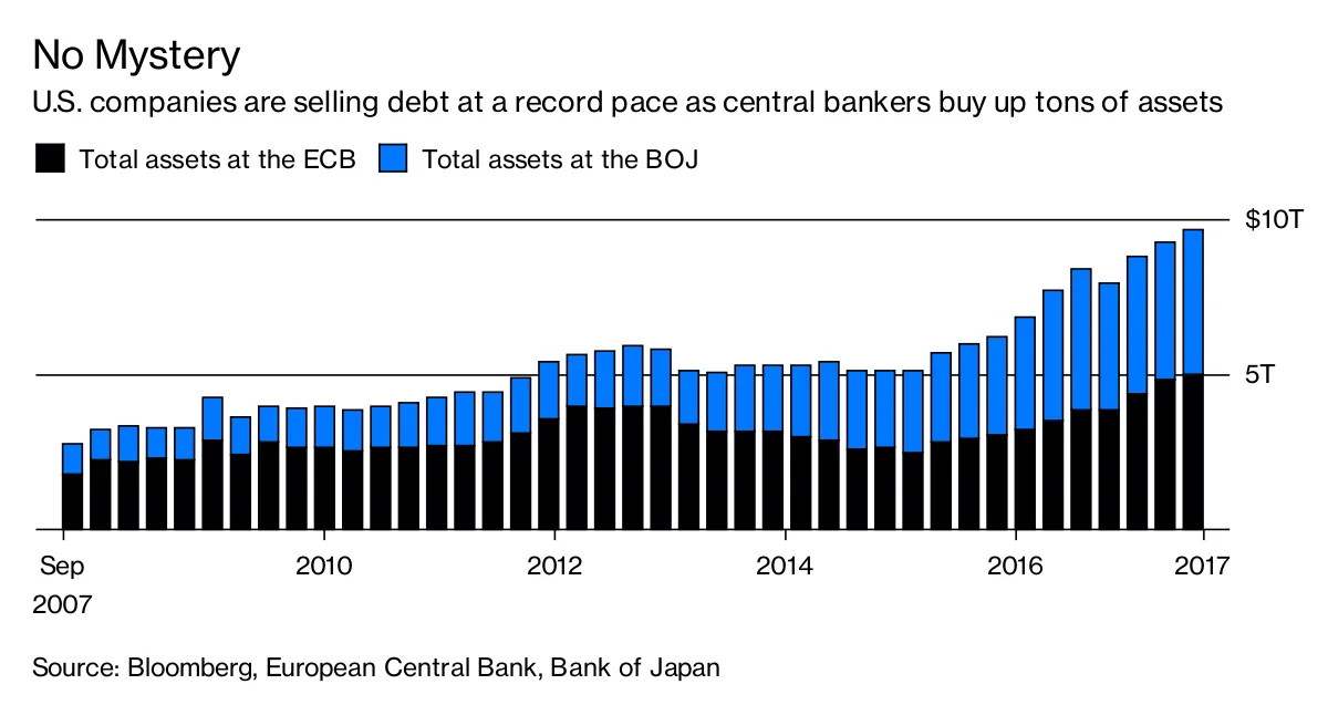 这种发行过剩是中央银行政策的可预测和预期的结果。它与日本和欧洲政策制定者持有的总资产的繁荣相吻合。这并不代表投资者的动物精神回归、热情高涨或对全球公司的信心投票。对于许多投资者来说,美国高等级债券只是发达市场政府债券之后的下一个最佳选择,而后者越来越难以找到且收益率极低。