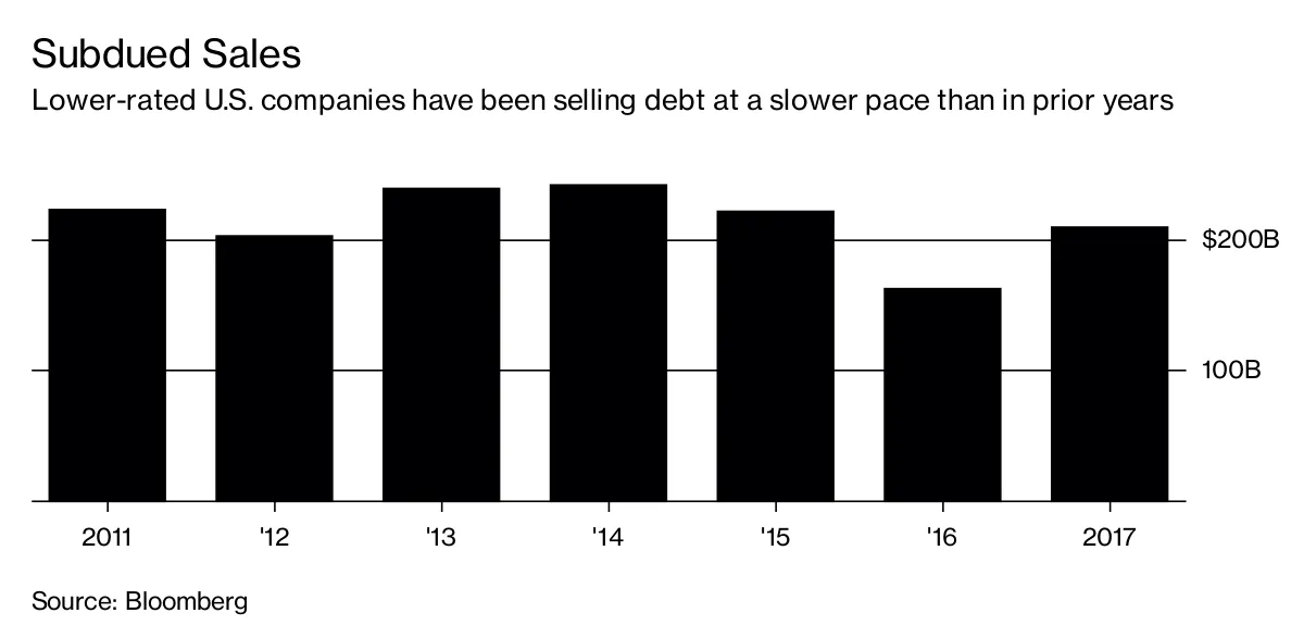 但是,为了让人们感受到投资者仍然多么怀疑,仅需看看今年美国高收益债券销售没有相应繁荣的情况。这种发行落后于2013、2014和2015年的速度。