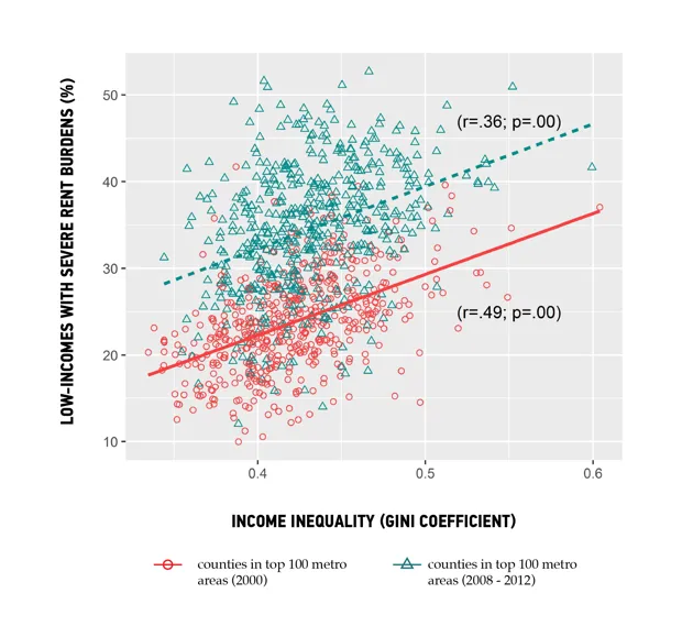 通过这些测量,研究发现美国最大城市中低收入家庭的收入不平等与租金负担之间存在密切联系。请查看研究中的两个散点图(如下),它们描绘了两者之间的关联。第一张图比较了基尼系数衡量的收入不平等与严重租金负担的低收入家庭的比例。红线显示了2000年租金负担家庭的比例,蓝线代表2008-2012年租金负担家庭的比例。两条线均向上走,显示了收入不平等与租金负担之间的正相关关系。随着收入不平等的上升,低收入家庭的租金负担也随之增加。