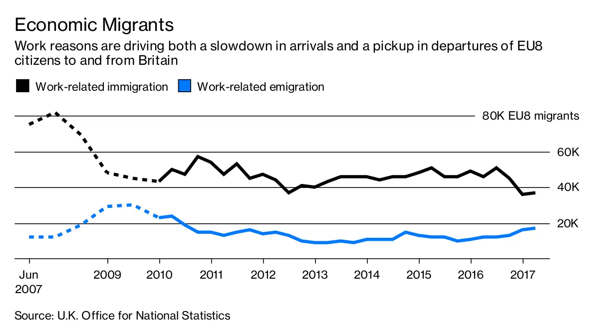 国家统计局最新的移民数据显示,在截至3月的年度中,离开该国的81,000人中约有40%是欧盟8国公民,这些国家是2004年加入欧盟的东欧国家。看来,来自家乡的吸引力可能与英国政治的推力同样重要。