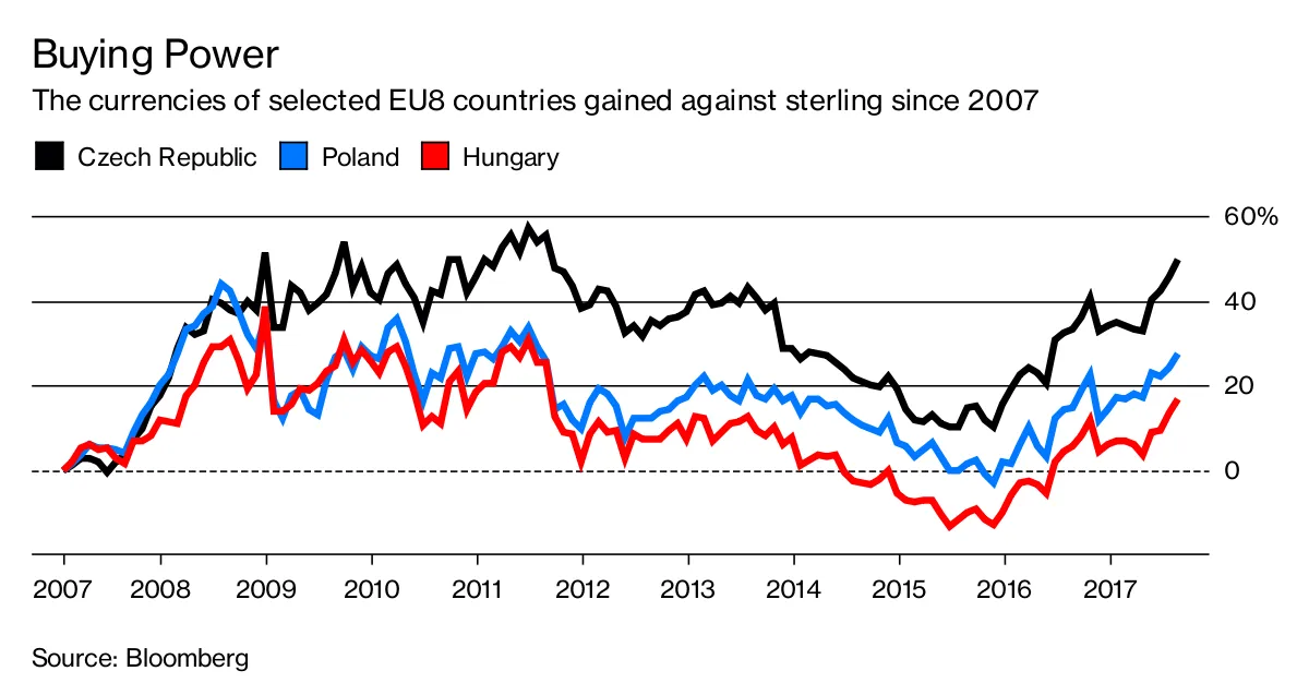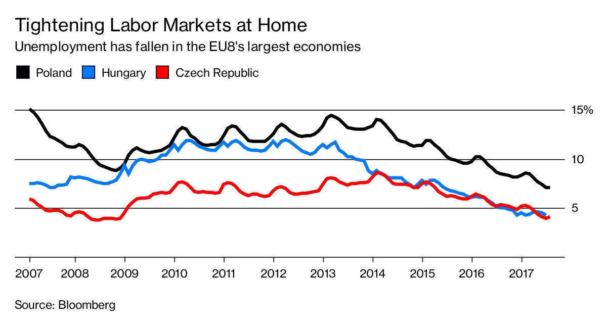 看来,不仅仅是对英国移民政策的不确定性在推动外国工人离开。欧盟8国的经济前景现在更加光明,所有这些国家的失业率都在下降。在波兰,失业率达到了自1990年代初以来的最低点,当时该国刚刚摆脱共产统治。