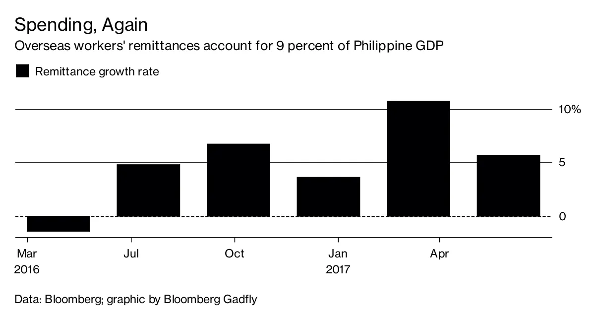 当然,住房销售需求的增强也是推动房地产股票上涨的一个因素。预售增长从2016年的8%加速到上半年的26%,因为海外工人向家乡汇回了更多现金。来自国外的汇款约占菲律宾GDP的9%。