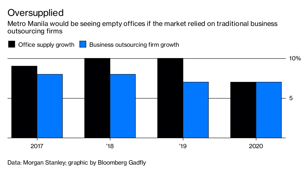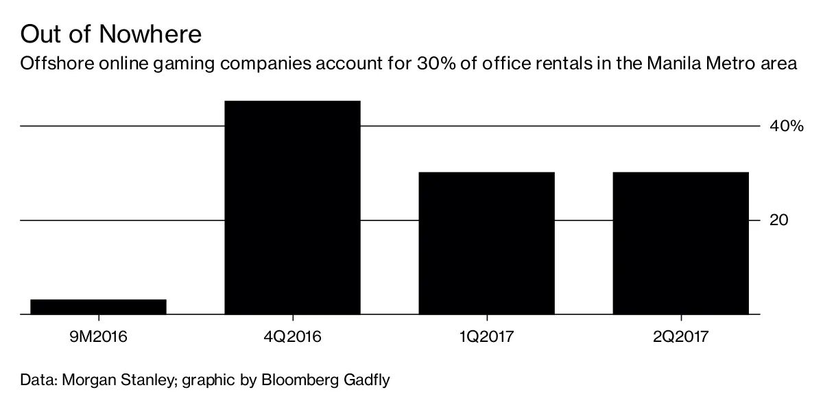 摩根士丹利估计,在线游戏运营商可以吸收今年下半年所有的新办公室供应。艾雅拉地产公司(Ayala Land Inc.)市值为120亿美元,在其最新的财报电话会议上表示,该开发商仍在计划在一年内租出90%的新办公室,因为需求正在“扩大”。