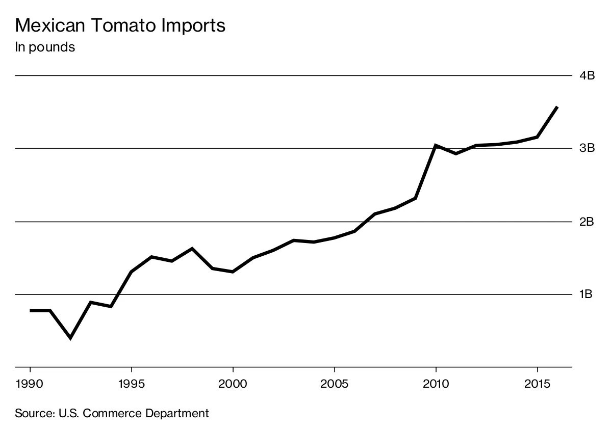 然而,越来越多的美国人购买的水果和蔬菜来自墨西哥,而不是佛罗里达州。根据政府数据,自1994年以来,美国的番茄年消费量已增加61%,达到69亿磅,而国内生产下降了11%,降至32亿磅。同时,墨西哥的番茄进口量已增加四倍,达到35.7亿磅,草莓进口量增加了六倍,达到5.68亿磅。这导致佛罗里达州出现了一波水果和蔬菜农场破产潮。