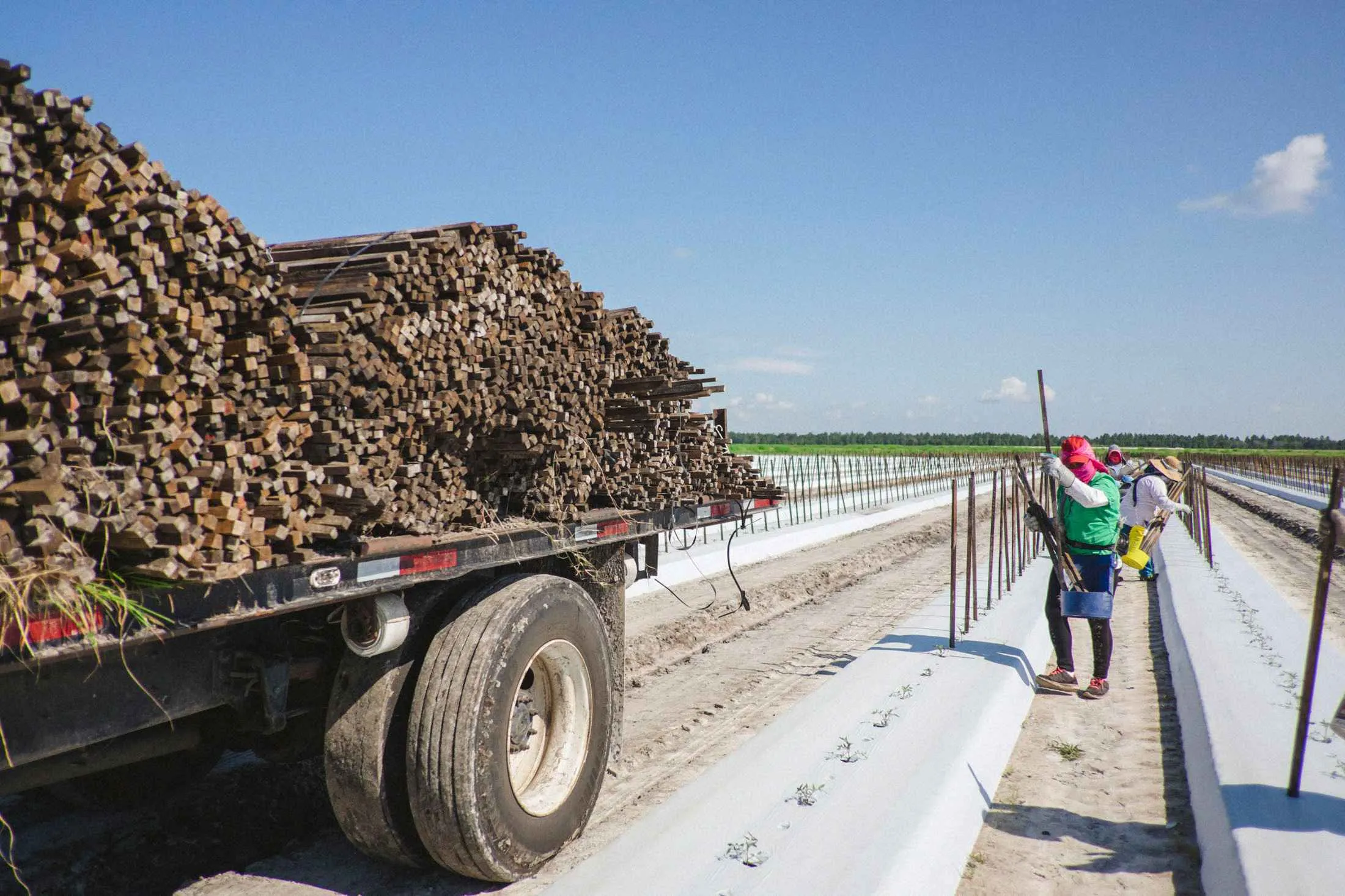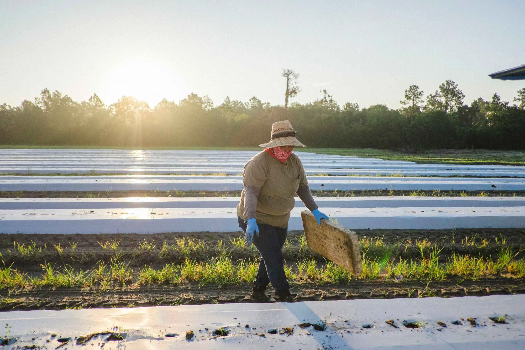 田间工人正在分类他们将在佛罗里达州杜埃特种植的幼苗。
