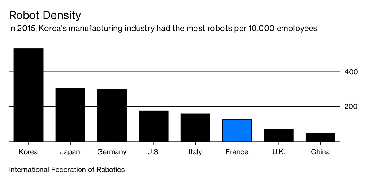 当然,法国在机械方面的投资正在加速,主要受到汽车行业的推动,该行业现在每100名工人中就有超过9个机器人——这是欧盟中第二高的比例,国际机器人联合会表示。但在德国,这一比例接近12,而在整个制造业中,法国落后于其欧洲竞争对手。像GM&S这样的中小企业没有资源像汽车巨头PSA和雷诺那样进行投资。