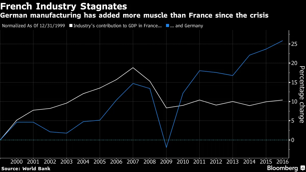 德国在2010年推出了帮助工厂工人提升技术知识的项目,巩固了其作为欧洲领先工业力量的地位,而法国则停滞不前。根据行业雇主组织的数据,法国工业在国内生产总值中的份额已从1980年的20%降至13%,自2008年以来,该行业已失去超过33万个工作岗位。