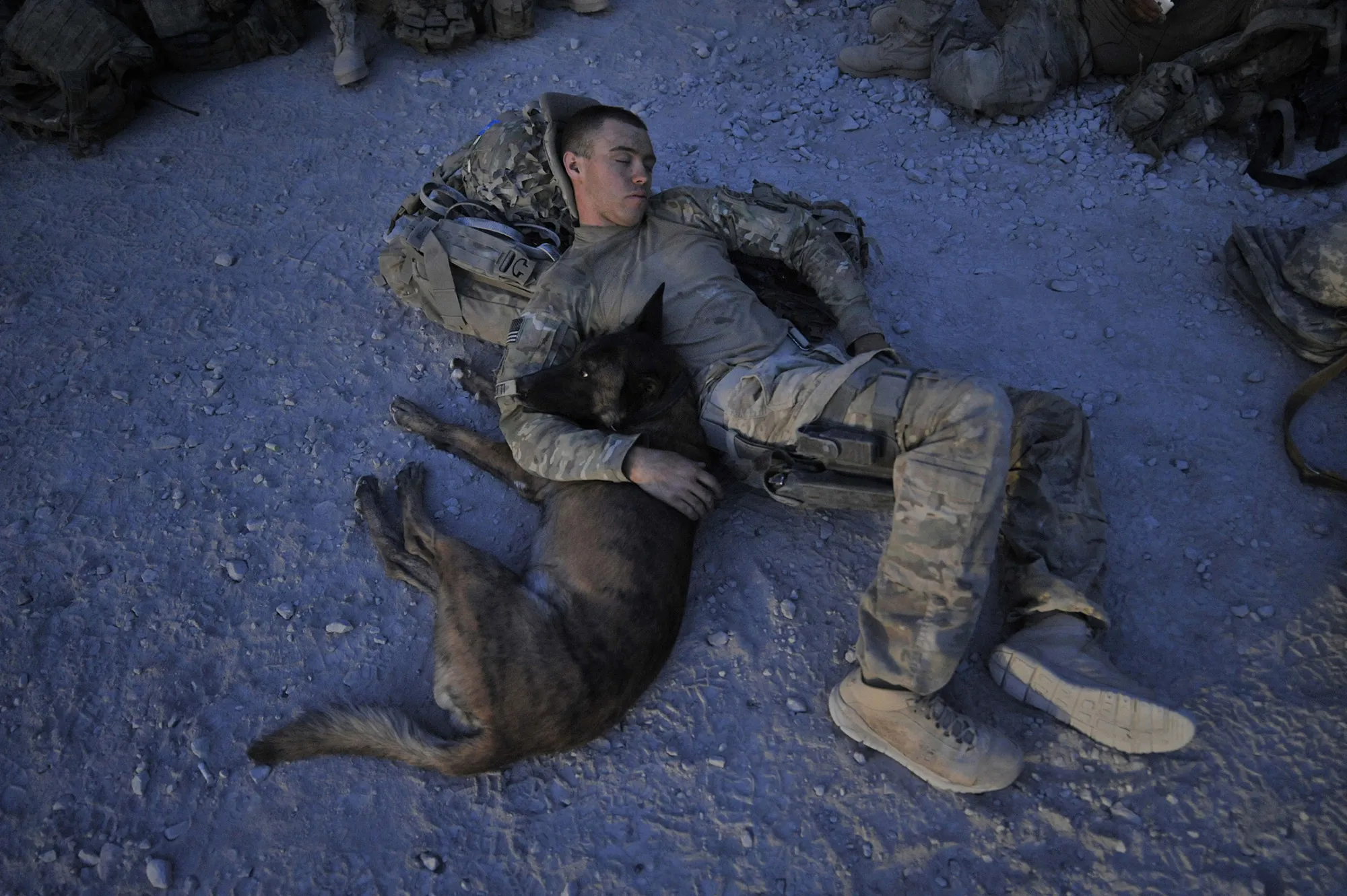 美国陆军特种兵贾斯廷·科莱蒂与一只比利时马林诺犬达斯蒂在阿富汗的一个机场休息,刚刚完成了一次过夜任务。