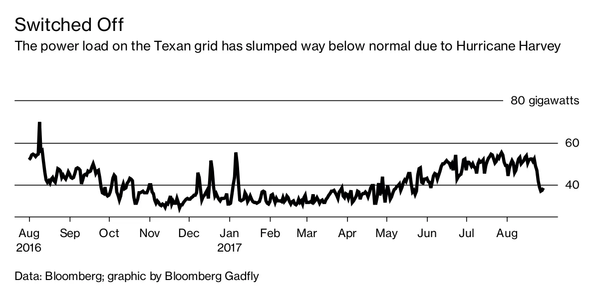 美国出口能力的九分之十位于或将位于墨 Gulf 沿岸。迄今为止,天然气市场对哈维飓风的低调反应表明,极端天气对该地区燃料需求的影响超过了对供应的任何干扰。您可以看到,由于工厂停产、工业客户关闭以及气温下降导致空调需求减弱,德克萨斯州的发电量已经大幅下滑: