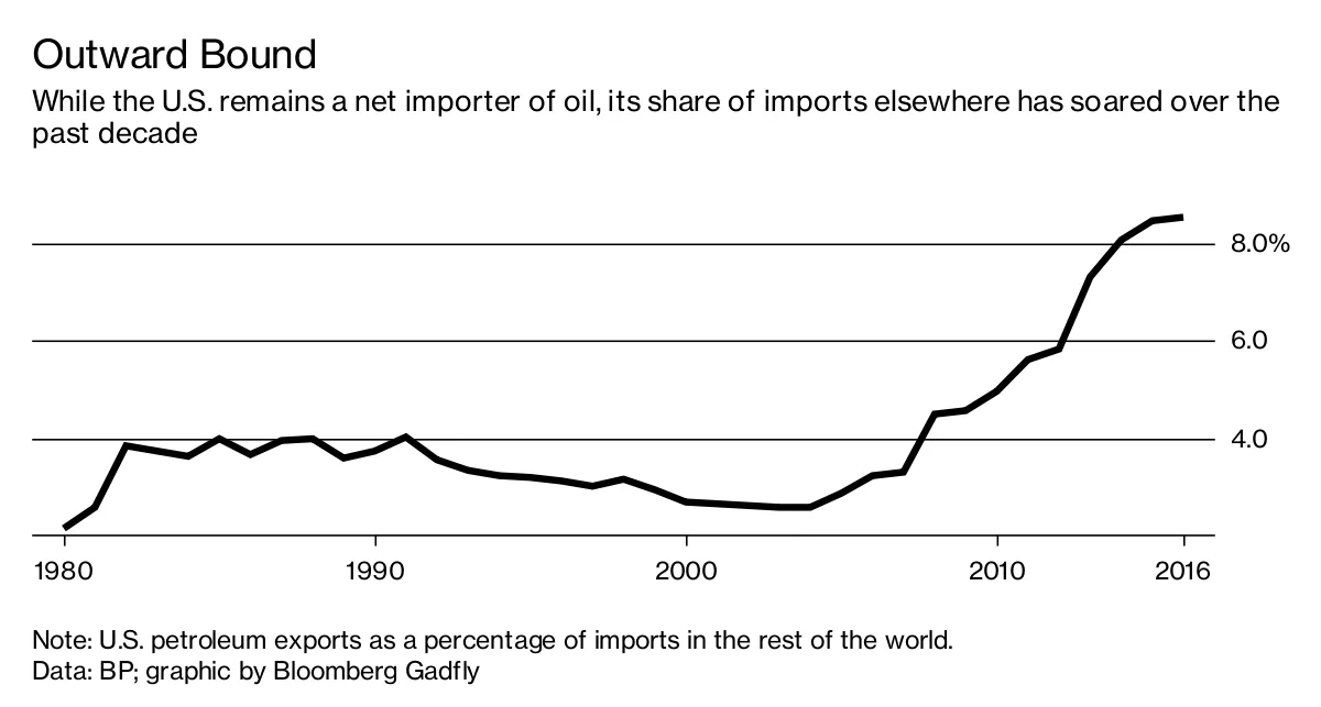 在石油方面,美国仍然是每天净进口约五百万桶的国家。不过,这一数字比十年前每天超过一千二百万桶有所下降,世界对从美国出口的桶的依赖程度远高于以往: