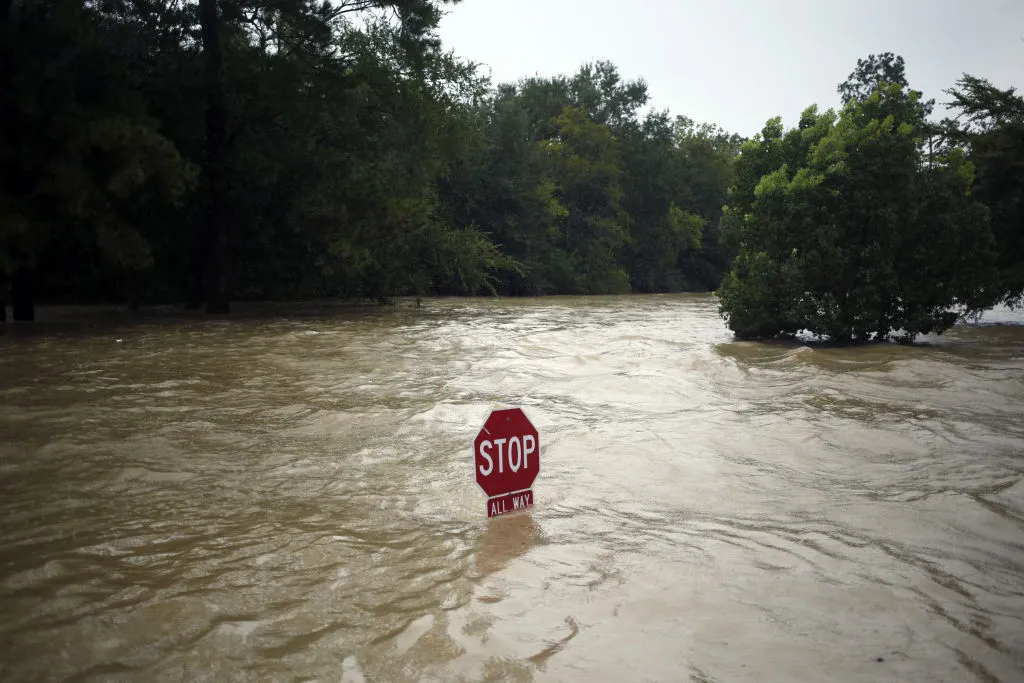 2017年8月28日,德克萨斯州春季,由于哈维飓风,“停止"标志矗立在洪水中。倾盆大雨和上涨的洪水使休斯顿陷入水中,毫无办法,严重影响了全球石油产业中心,并考验了这个拥有近12%美国工人的州的经济韧性。