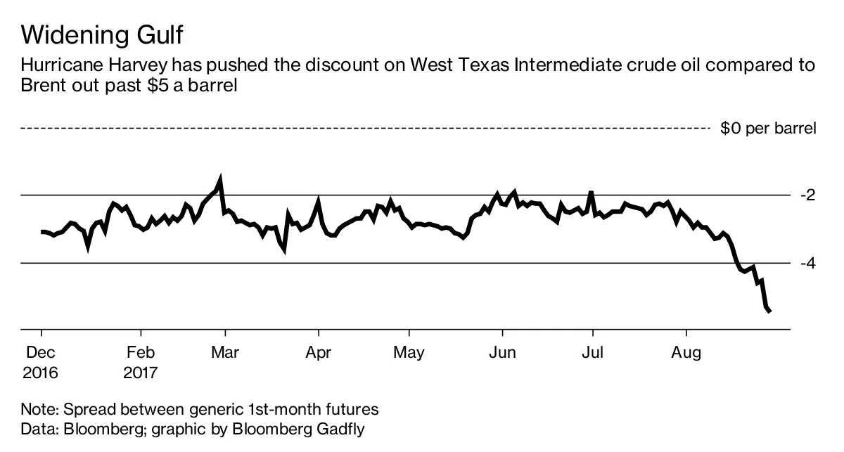 哈维关闭了如科珀斯克里斯蒂等港口,截至周二早晨,至少13%的美国炼油能力基本上被封锁,无法处理或出口本应处理的石油。这,加上在灾难中抑制的国内需求,解释了美国原油价格的疲软,并为一些国际等级如布伦特增添了一些强度。