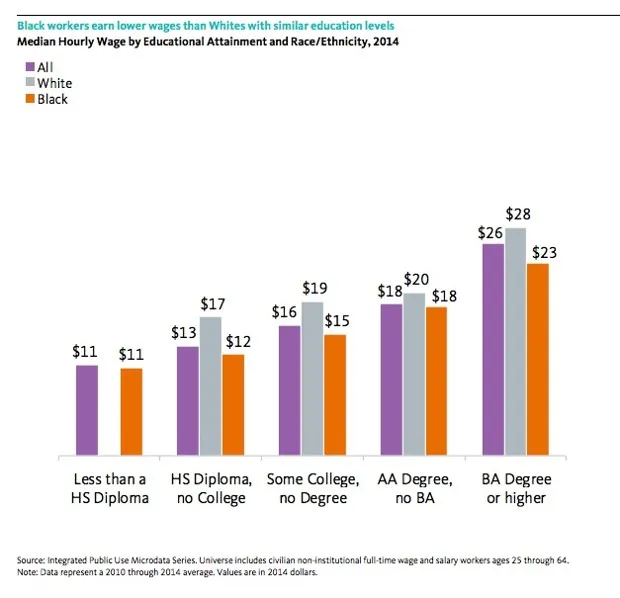 尽管常常报道新奥尔良充斥着贫困,但很容易忘记这里有大量中产阶级社区。但即使是这些社区,除非他们拥有史密斯所说的那些“资源”,否则也很难找到工作和体面的工资。政策链接的新奥尔良公平状况报告指出,非裔美国人的失业率在每个教育水平上都“显著高于其他群体”。黑人工人在每个教育水平上的工资也低于白人工人。
