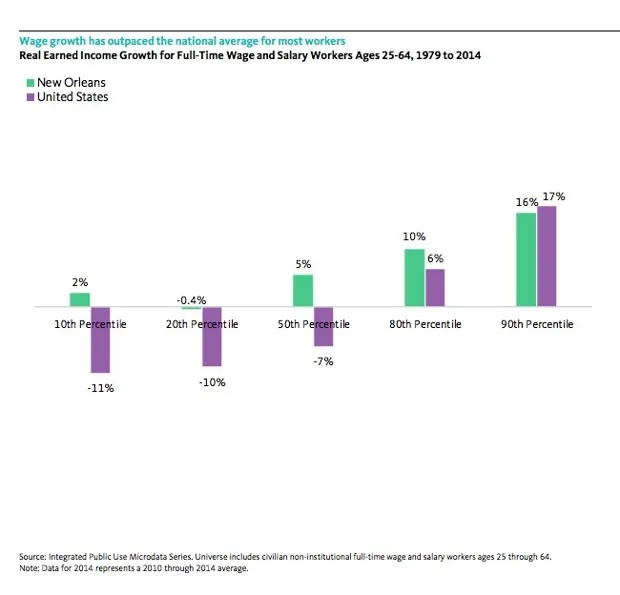 在卡特里娜飓风过后的几个月里,曾经有过一些工资平衡,当时餐馆和酒店提供双位数的时薪和价值数千美元的奖金以吸引流离失所者回到城市。如今,新奥尔良的食品准备和服务的平均工资又回到了个位数,奖金更是无从谈起。自1979年以来,最低收入工人的工资下降,而最高收入工人的工资增长了16%。