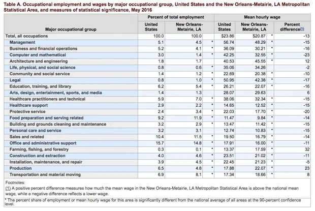 在YURPers来来去去之后,当地人的就业情况几乎和以前一样严峻。新奥尔良的就业市场糟糕,这并不是什么秘密。它过于依赖服务和旅游相关行业的时薪非工会工作。自1980年代以来就是这样,当时 石油繁荣破灭 了新奥尔良。新奥尔良的劳动倡导者一直是全国 争取15美元 运动的一部分,以寻求生活工资,但到目前为止,他们不得不接受去年生效的 生活工资轻型条例,将工资提高到 $10.55每小时。州立法机构的一项提案,计划到2019年将最低工资从$7.50提高到$8.50 在今年五月失败了。