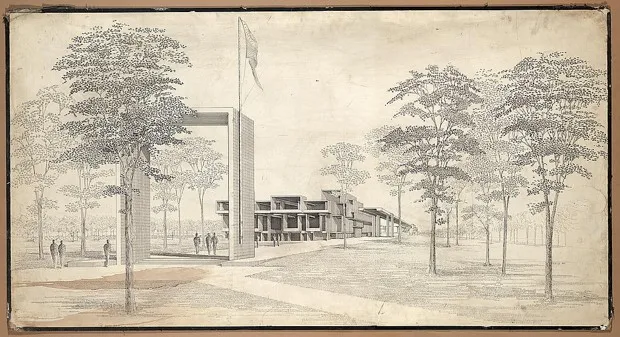 保罗·鲁道夫为橙县政府中心设计的效果图,来自1963年的演示。它于1966年获得建设批准。保罗·鲁道夫/国会图书馆最终设计于1966年获得橙县监督委员会的批准。《保罗·鲁道夫的建筑》的作者蒂姆·罗汉指出,设计的时机——在1960年代中期的社会动荡和民权进展中——影响了建筑师的视野。“这个项目将法院带入现代时代,并传达了适当的活力,当时他们开始关注社会正义问题,”他说。