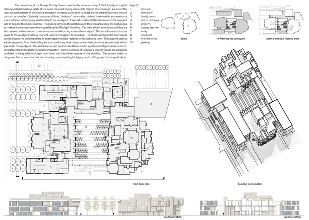 designLAB为橙县政府中心设计的方案,2015年获得波士顿建筑师协会颁发的“未建成建筑奖”。designLAB米克洛斯和designLAB加入了Clark Patterson Lee参与该项目,最初被要求进行新的建筑评估研究,随后对所有三座建筑进行再利用研究。然而,一些政治操作介入了。“大多数共和党人希望将其拆除,而民主党人则支持保留它,”米克洛斯说。最终达成了一项妥协:三座建筑中最有问题的一座将被考虑替换,同时在县的目标预算6000万美元内进行全面翻新的预算。