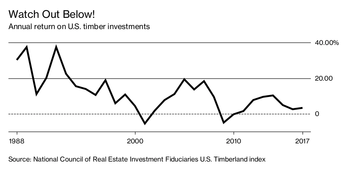 维克森林大学也在减少其林业投资,将其对11亿美元投资组合的承诺削减至1%,而十年前为5%,校方基金负责人吉姆·邓恩表示。他提到对投资回报的担忧。根据国家房地产投资受托人委员会的数据,1980年代末期,美国林地的年回报率曾高达37%。这些超额利润为今天的缓慢升值奠定了基础。根据乔治亚大学森林金融教授乔恩·考尔菲尔德的说法,机构资金的涌入抬高了可用森林的价格,压低了潜在回报,因为经济增长放缓减少了对木材的需求。在截至6月的最近财政年度,林业的回报仅为3.6%,而标准普尔500指数的回报为15%。