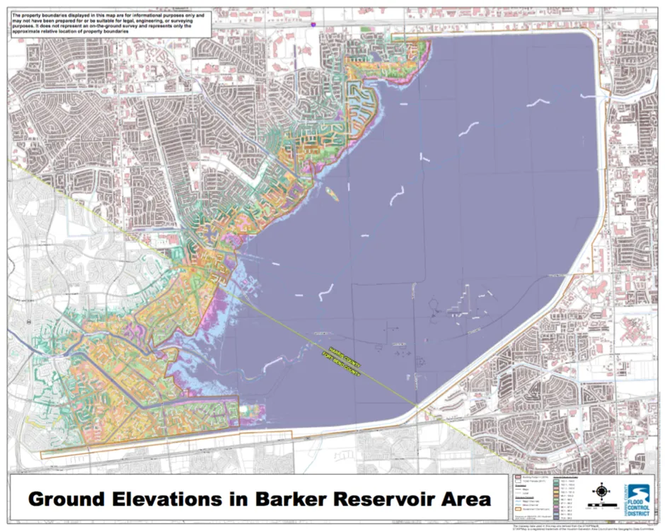 哈里斯县国土安全与应急管理办公室上面的地图显示 阿迪克斯水库周围的地面高度。绿色轮廓延伸到周围社区,代表111-112英尺的高度。黄色阴影区域显示水库的洪水现在的水位(在108英尺)。