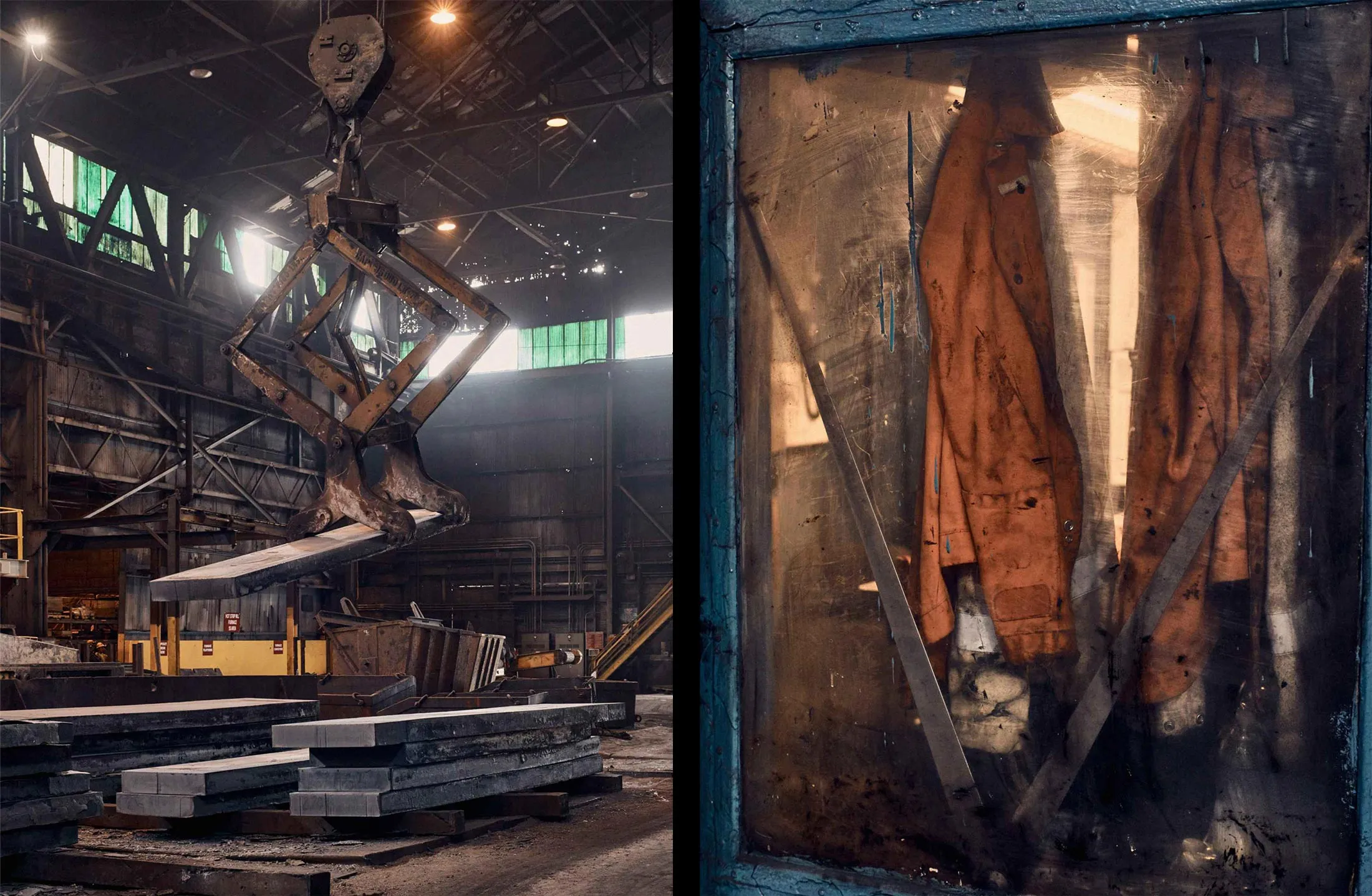左侧:一台起重机在伊尔文工厂移动一块钢板;工作夹克挂在窗户上。摄影师:罗斯·曼特尔,彭博商业周刊