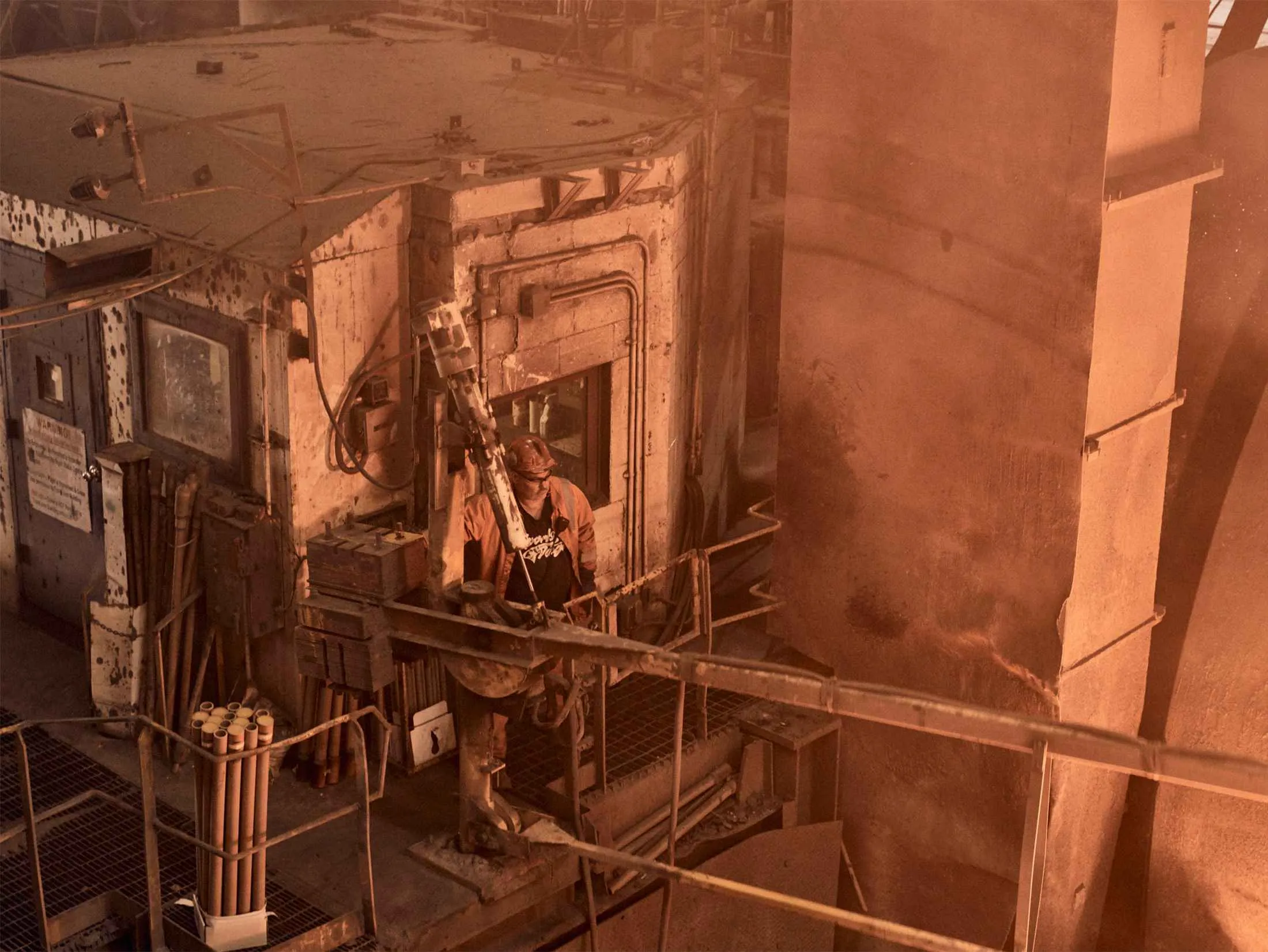 美国钢铁公司的员工在埃德加·汤姆森工厂监督生产。在这个阶段,液态钢正在被形成为固体板材。摄影师:罗斯·曼特尔,彭博商业周刊