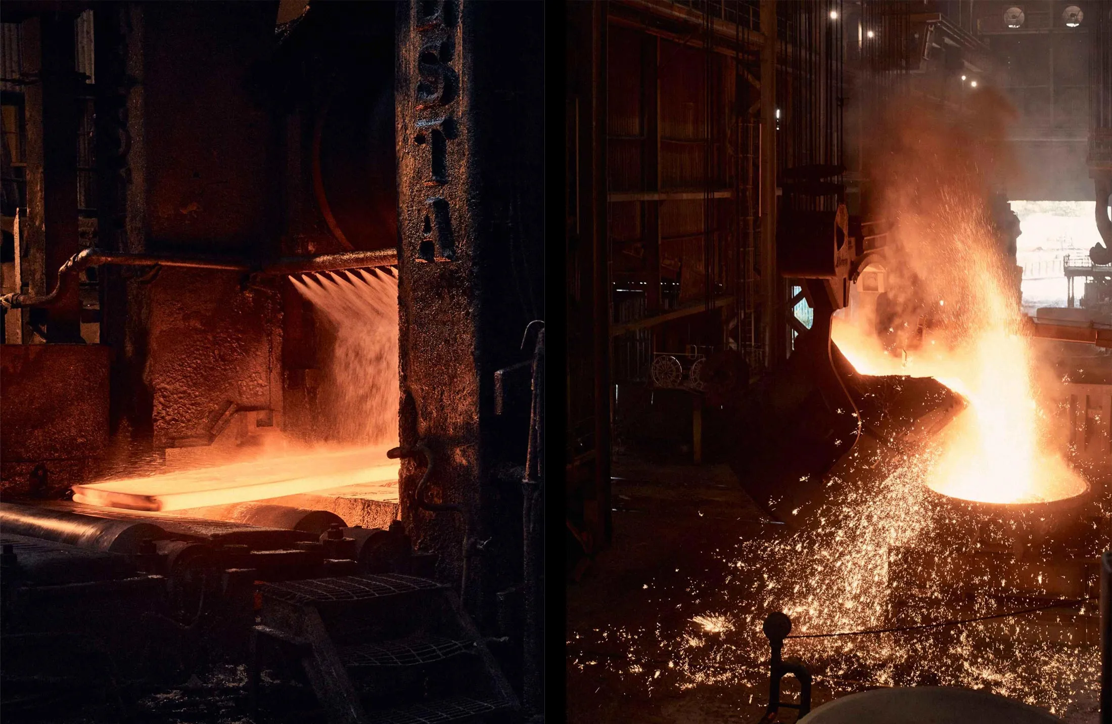 左侧:热钢通过美国钢铁公司在宾夕法尼亚州西米夫林的伊尔文工厂的轧制——或金属成型——厂;在埃德加·汤姆森工厂,熔融钢在混合后被倒入大锅中。摄影师:罗斯·曼特尔,彭博商业周刊