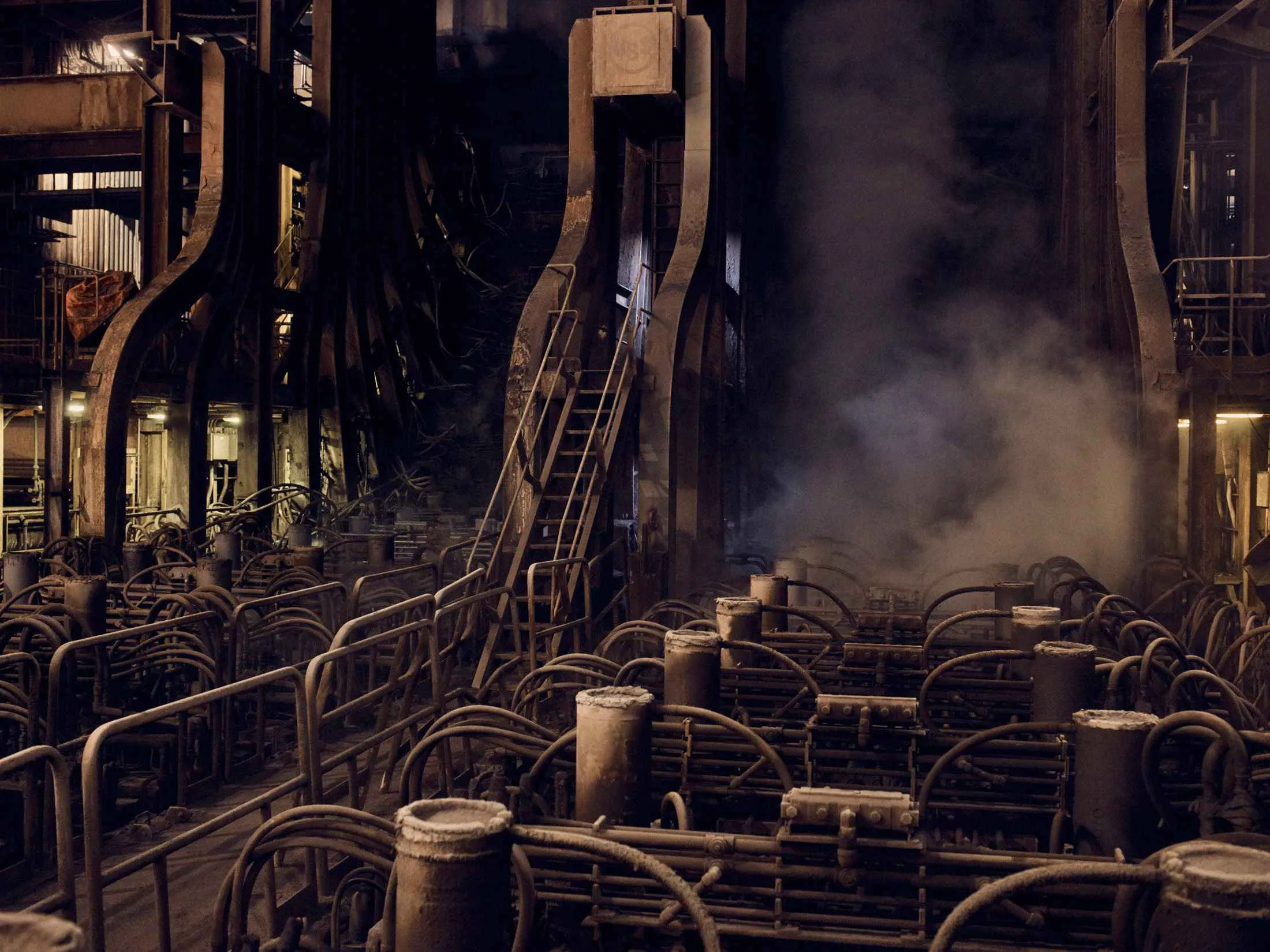 蒸汽和机械环绕着埃德加·汤姆森的连续铸造机。摄影师:罗斯·曼特尔,彭博商业周刊