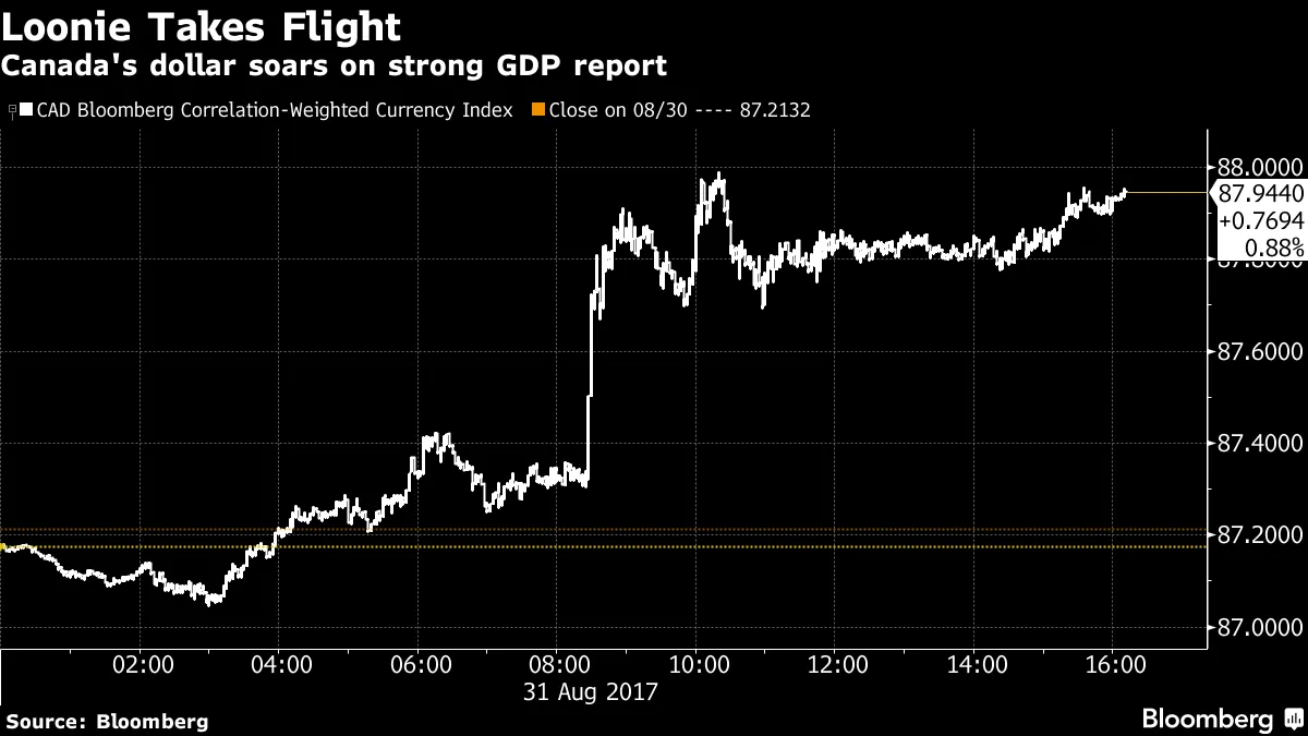 特朗普交易让位于贾斯廷的震撼在政府周四表示经济在第二季度以4.5%的速度增长后,加拿大元看起来非常有吸引力——在七国集团中名列前茅,并且是六年来的最快增长率。这些增长是自2008-2009年全球衰退以来家庭支出最大的一次狂欢的结果。加拿大元在主要货币中是最大的赢家,彭博社的相关加权货币指数显示,加元上涨了多达0.89%。增长的激增应该有助于巩固加拿大银行今年继续加息的机会——可能在下周就会开始——因为该国经济接近满负荷运转,正处于十多年来最强劲的增长期,彭博新闻的西奥菲洛斯·阿尔吉提斯指出。他提到,贾斯廷·特鲁多总理的财政政策正在产生影响,特别是去年生效的减税和增强儿童福利政策。