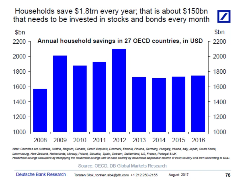 全球储蓄过剩对股票和信贷有利够了,坏消息。风险资产的反弹可以继续,如果你考虑到需求是近年来中央银行创造的所有现金的副产品,以确保全球经济不会再次陷入衰退并避免通货紧缩。即使现在,中央银行的资产负债表每月也在扩大约3000亿美元,所有这些新钱都在市场上运作。德意志银行董事总经理兼国际经济学家托尔斯滕·斯洛克进一步分析。他认为,除了中央银行的现金外,还有可能来自家庭的额外1500亿美元。他通过将家庭储蓄率与27个经济合作与发展组织国家的可支配收入相乘得出这个数字。他在一份研究报告中写道,只要通货膨胀和利率保持低位,这种情况就可以继续。“低通货膨胀和稳健增长继续是全球股票和信贷的甜蜜点,”斯洛克写道。