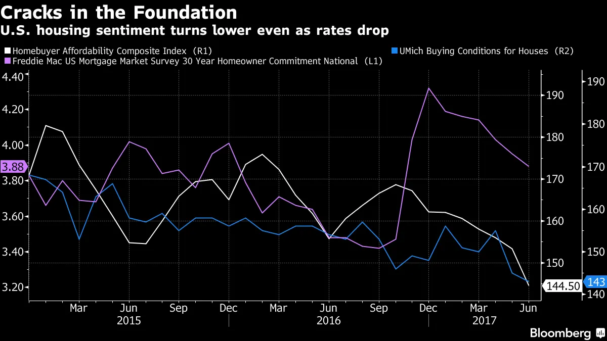 彭博社商业周刊不是囚犯。寻求庇护者占据了拜登承诺关闭的监狱美国正在用寻求庇护者填满臭名昭著的前监狱大学橄榄球需要向MLB学习一课那些销售比职业选手更多棒球棒的网红兄弟们房地产市场可能正在回落除了低通胀,许多债券交易者在解释他们为何不太乐观时谈到的另一件事是消费者的健康。尽管经济增长不错,但消费者看起来很紧张,这开始在他们的消费习惯中显现出来。这在最近的住房数据中得到了体现。在过去几周内,报告显示每月新房销售、现有房屋销售、住房开工和建筑许可证均有所下降。所有这些发生在抵押贷款利率降低的情况下。有些人会说这与紧张的供应关系更大,但根据全国房地产经纪人协会的数据,现有房屋的供应量为4.2个月,符合金融危机前的平均水平。或许更令人担忧的是,NAR周四表示,其购房者可负担性指数处于2008年以来的最低水平,而最近的密歇根大学消费者信心报告显示,其购房条件指数是自2011年以来的最低水平。