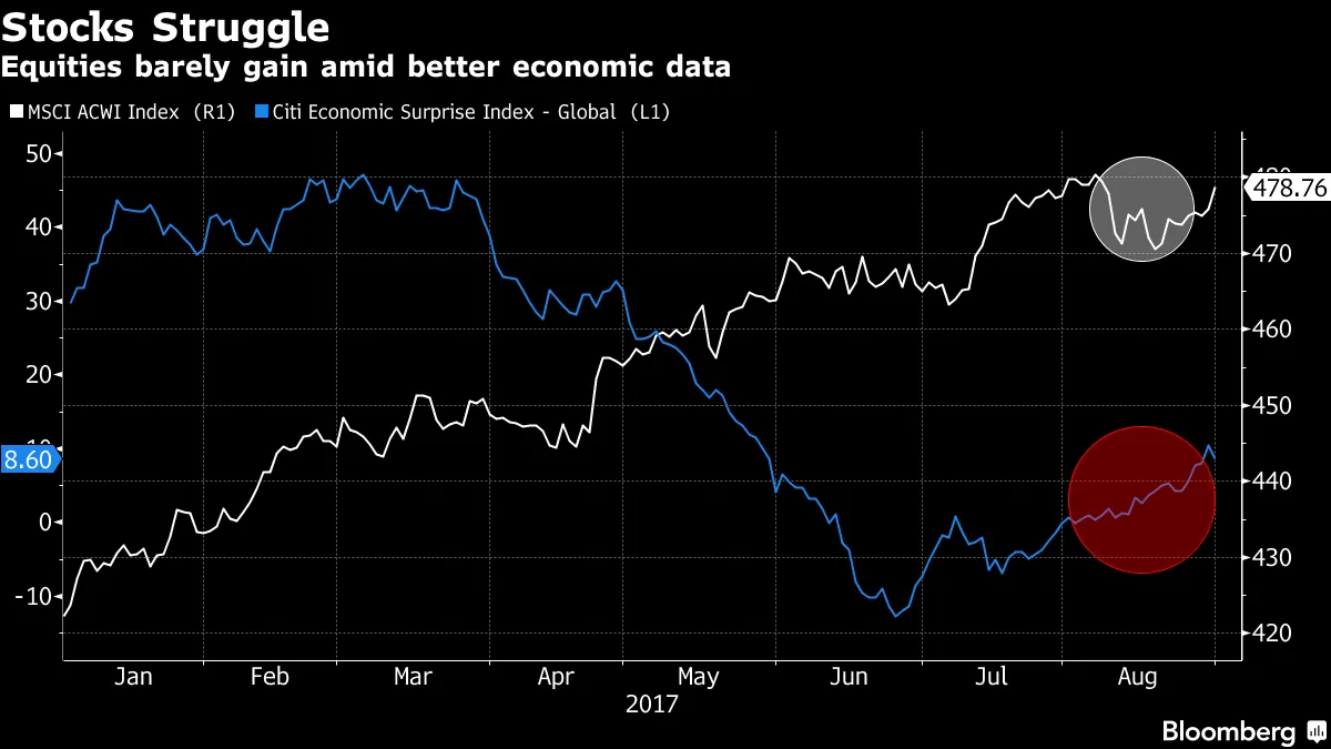 **就这些吗?**八月对股票来说很艰难,MSCI全球所有国家指数在大部分时间都处于负值,直到周四的晚间反弹才勉强回到正值。虽然乐观者可能会说这显示了股票的韧性,但悲观者会指出,这种挣扎只突显了市场的脆弱,因为最近的经济数据非常强劲。花旗经济意外指数——衡量超出预测的数据与未达预测的数据——在经历了大部分六、七月的负值后,本月转为正值。结论是,股票在努力寻找下一个催化剂。这个催化剂来自哪里,谁也无法猜测,因为盈利预期已经处于历史高位,而全球经济的同步复苏在很大程度上已经反映在价格中。摩根大通的分析师对看跌和看涨的标准普尔500指数合约的比较发现,基于自1928年以来的数据,未来三个月基准指数上涨15%的隐含概率实际上被定价为零。