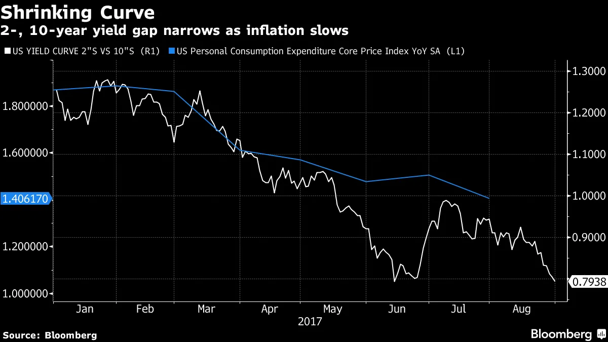 美国国债正朝着自2016年6月以来回报率最佳的月份迈进,彭博巴克莱美国国债指数在8月截至周三上涨了0.95%。如果债券交易员真的相信经济在增强,那么对这些超级安全资产的需求应该会减弱。还有一点:收益率曲线,即短期和长期利率之间的差异,正在缩小。这通常发生在对经济信心低迷的时候,因为交易员不期望增长足够强劲以产生更快的通货膨胀,从而侵蚀固定支付的价值。实际上,周四的一份政府报告显示,美联储首选的通货膨胀指标——核心个人消费支出指数——在7月同比仅上涨了1.4%,是自2015年以来的最小增幅。