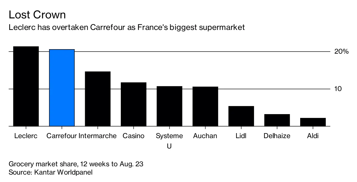 在美国和英国,德国折扣零售商阿尔迪和利德尔就是这样的例子。在法国,是乐购,这家私营低价超市已超越家乐福,成为法国市场份额最大的杂货商。