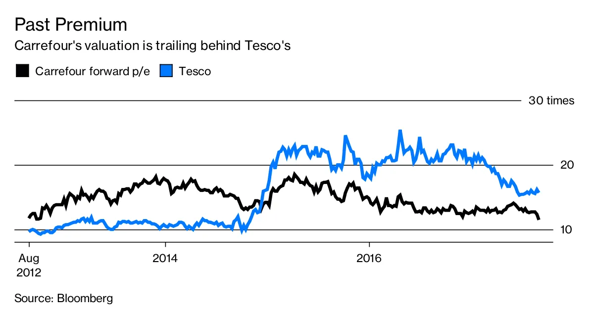 包括星期四的15%下跌,家乐福的股价在过去一年中下跌了27%,并且与特易购相比,交易价格显著折扣。这是合理的,因为尽管特易购并不完美,但它在复苏的道路上走得更远。