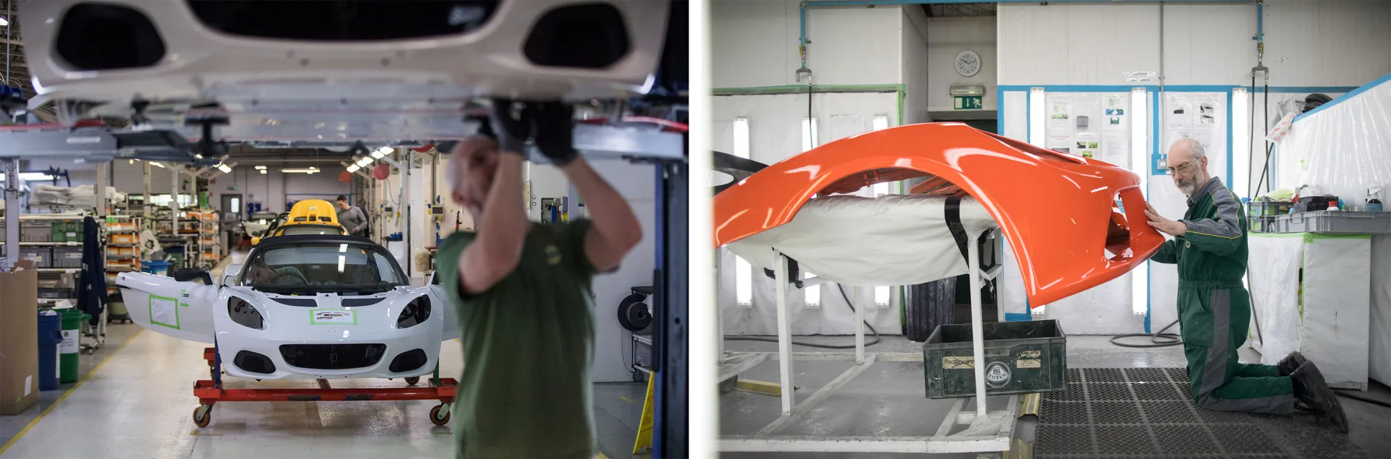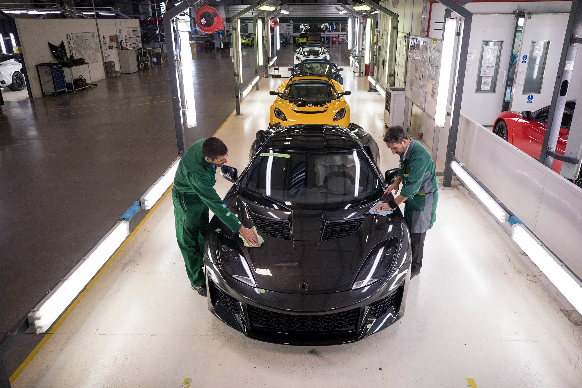 员工在英国诺里奇附近的赫瑟尔莲花工厂的检验线上为莲花埃沃拉跑车打磨。