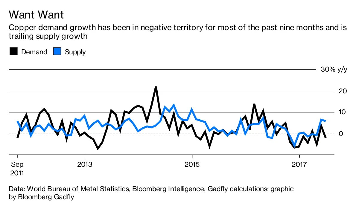 与其关注增长指标,不如说衡量铜需求强度的更好方法是实际观察铜需求。在这方面,前景令人不安:全球消费在过去九个月中大部分时间都在逐年下降,而供应增长接近2014年以来的最快速度。