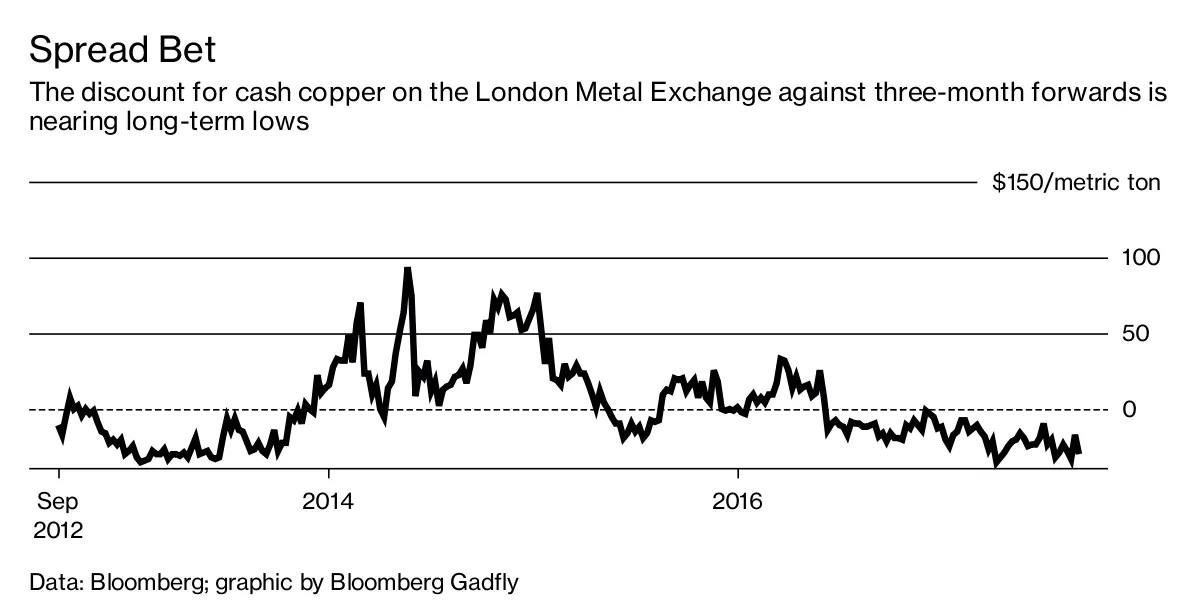 期货曲线描绘了类似的图景。现金与三个月期货的价差,当基本需求导致消费者为快速供应支付溢价时,会强烈转为正值,目前仍在从2014年的牛市时期向下走。7月19日现金金属的37美元折扣是自2013年以来在该指标上最尖锐的正向价差1504509165202。