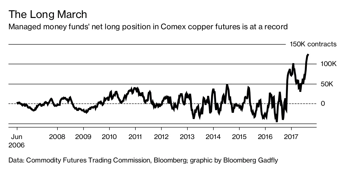 这种强劲中存在风险。交易者购买铜并不是因为他们热爱这种金属,而是因为他们预期价格会上涨。当价格上涨时,他们在某个时刻可能会选择卖出。
