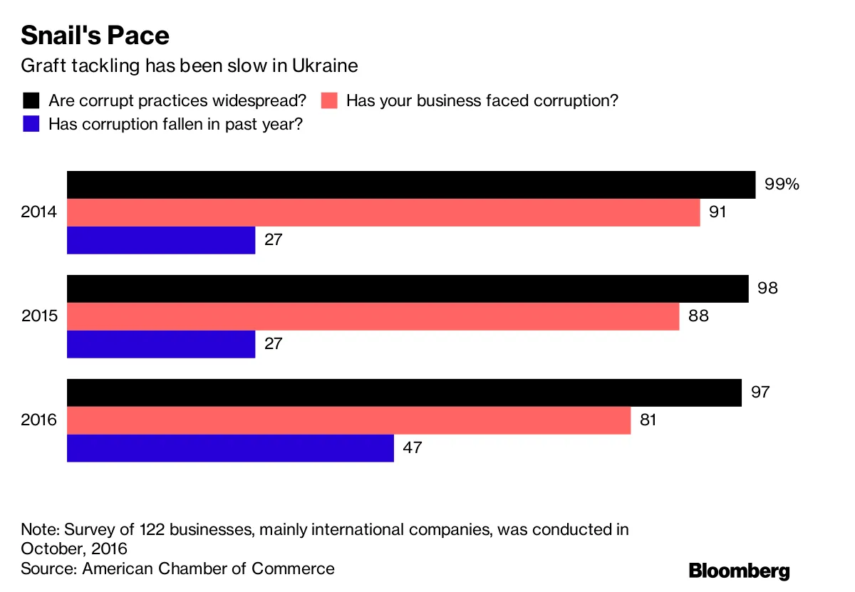 百万美元的银行账户、豪宅和奢侈品的揭露引发了公众的愤怒,他们已经认为猖獗的腐败比俄罗斯更具威胁。乌克兰的邻国在2014年从乌克兰吞并了克里米亚,并继续支持在工业东部的持续叛乱,这场叛乱已造成1万人丧生。